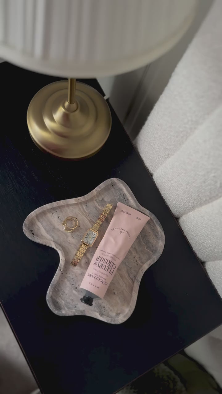 Inspired by the soft curves of desert landscapes, the Sahara Tray is a sculptural decor piece carved from grey travertine. Its fluid, freeform edges and honed finish create a refined yet natural presence — perfect for styling on coffee tables, consoles, or bedside surfaces.